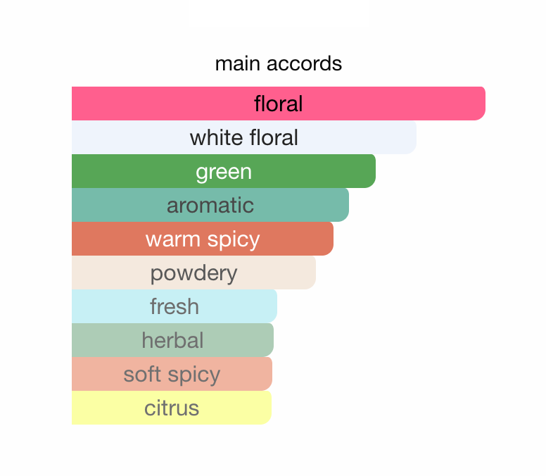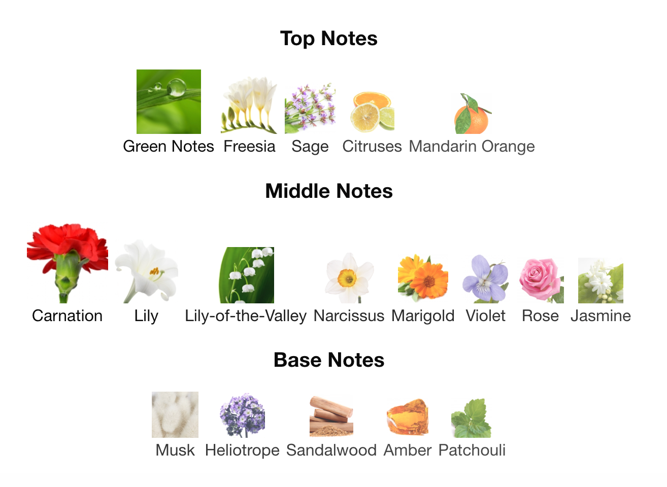 - Middle Notes: Carnation, Lily of the Valley, Narcissus, Marigold, Violet, Rose, Jasmine.