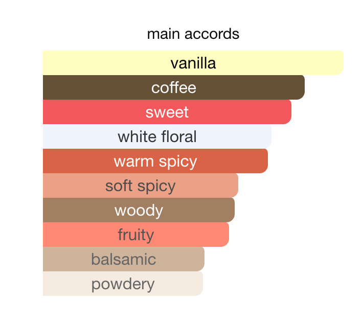 Top notes are Pear, Pink Pepper and Orange Blossom; middle notes are Coffee, Jasmine, Bitter Almond and Licorice; base notes are Vanilla, Patchouli, Cashmere Wood and Cedar.