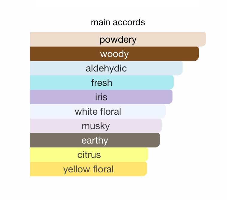 The top notes of the scent are aldehydes, ylang-ylang, neroli, bergamot, and lemon, with middle notes of iris, jasmine, rose, orris root, and lily of the valley. The base notes are civet, sandalwood, amber, musk, moss, vetiver, vanilla, and patchouli