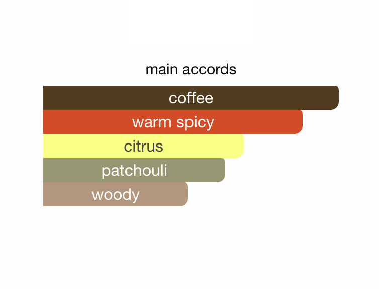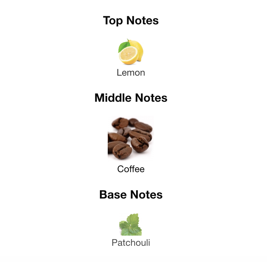 features a simple yet bold profile with Lemon as the top note, a rich Coffee heart, and an earthy Patchouli base, creating a woody-spicy scent with a prominent coffee-citrus vibe. A newer, more intense Parfum version adds Lavender, Tonka Bean, Vanilla, & woods for a deeper, amber-woody drydown