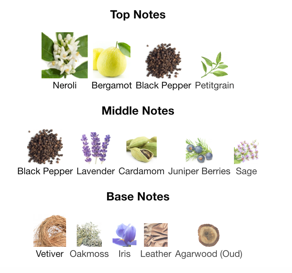 a modern, woody aromatic fragrance that starts with a fresh, citrusy burst of bergamot and neroli, followed by a heart of spicy black pepper, lavender, and cardamom