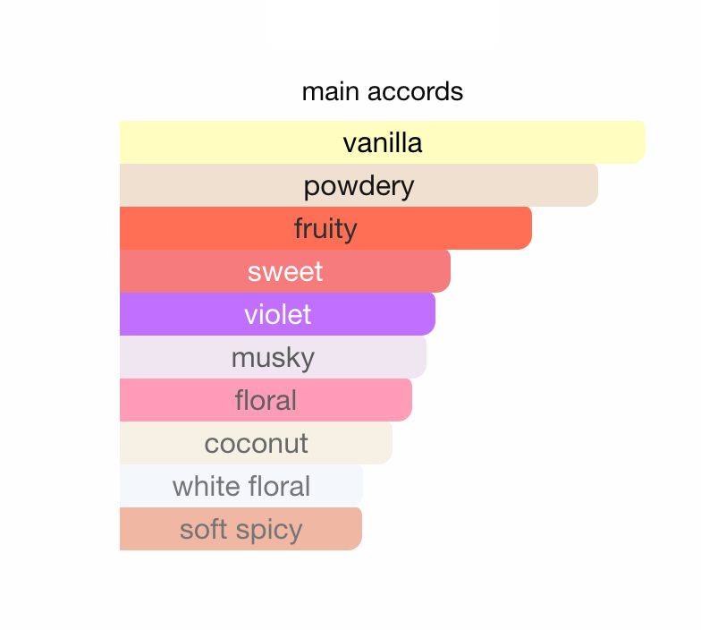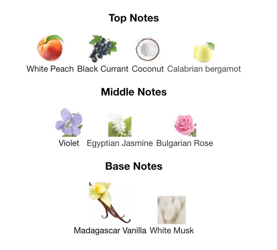 Black Currant, Coconut, Calabrian Bergamot and White Peach. In the middle lies floral fragrances from Rose, Jasmine and Violet. Towards the base comes deep whiffs of White Musk and Vanilla for a scent that is uncomplicated and intriguing.