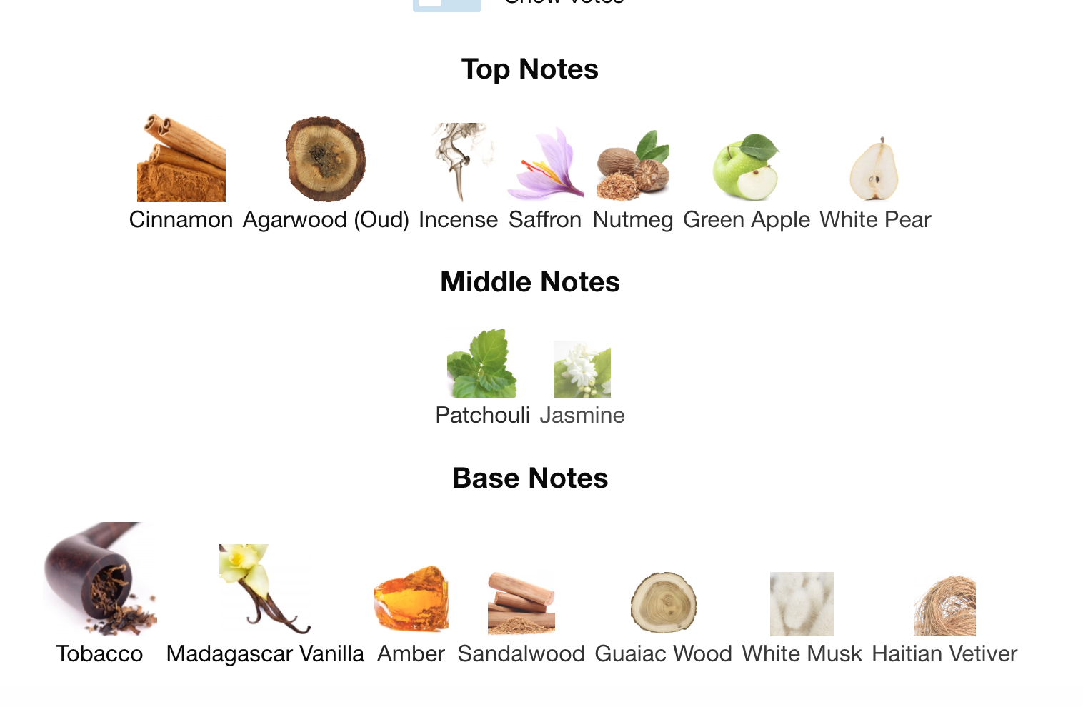 Top note: saffron, cinnamon, incense, nutmeg, white peach, green apple and nepalese oud. Middle note: leaves of patchouli and delicate jasmine. Base note: precious tobacco, amber, woody notes, vetiver, vanilla pods and white wusk.