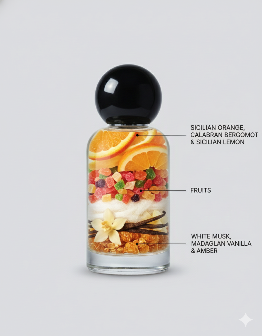 Fresh, fruity and thoroughly contemporary in spirit, it blends top notes of Sicilian orange and lemon with a Mediterranean fruit basket at the heart. White musk, amber and Madagascar vanilla beans sit at the base and reveal themselves slowly as time goes by