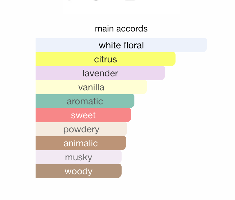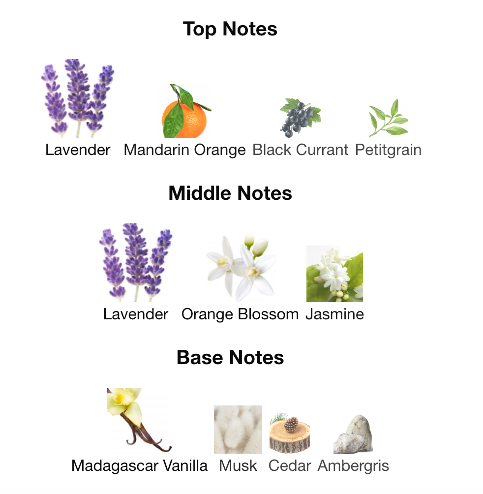 Top notes are mandarin orange, lavender, black currant and petitgrain. Middle notes are jasmine, lavender and orange blossom. Base notes are madagascar vanilla, cedar, ambergris and musk.